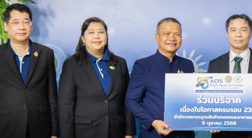 สำนักงานมาตรฐานสินค้าเกษตรและอาหารแห่งชาติ (มกอช.) จัดงานเนื่องในโอกาสวันคล้ายวันสถาปนา มกอช. ครบรอบ 23 ปี ประจำปี 2568 ในวันที่ 9 ตุลาคม 2568 ภายใต้แนวคิด “23 years ACFS : From Farm to Future : Safety / Security / Sustainability – 23 ปี มกอช. จากฟาร์มสู่อนาคตจากฟาร์มสู่อนาคต : มุ่งมั่นความปลอดภัย สร้างความมั่นคง สู่ความยั่งยืน”