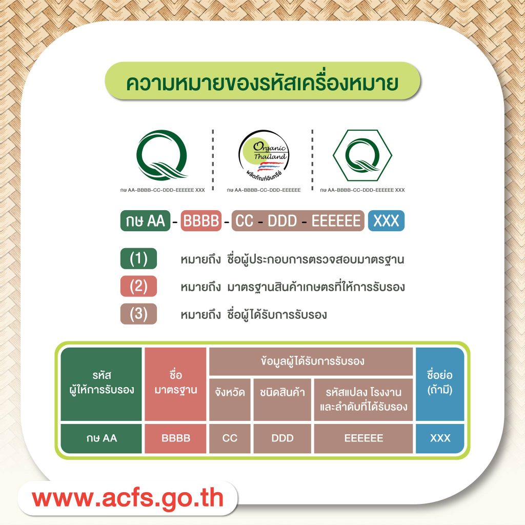 - วิธีการแสดงเครื่องหมายรับรองมาตรฐานสินค้าเกษตรหรือ Q – สำนักงานมาตรฐานสินค้าเกษตรและอาหารแห่งชาติ (มกอช.)