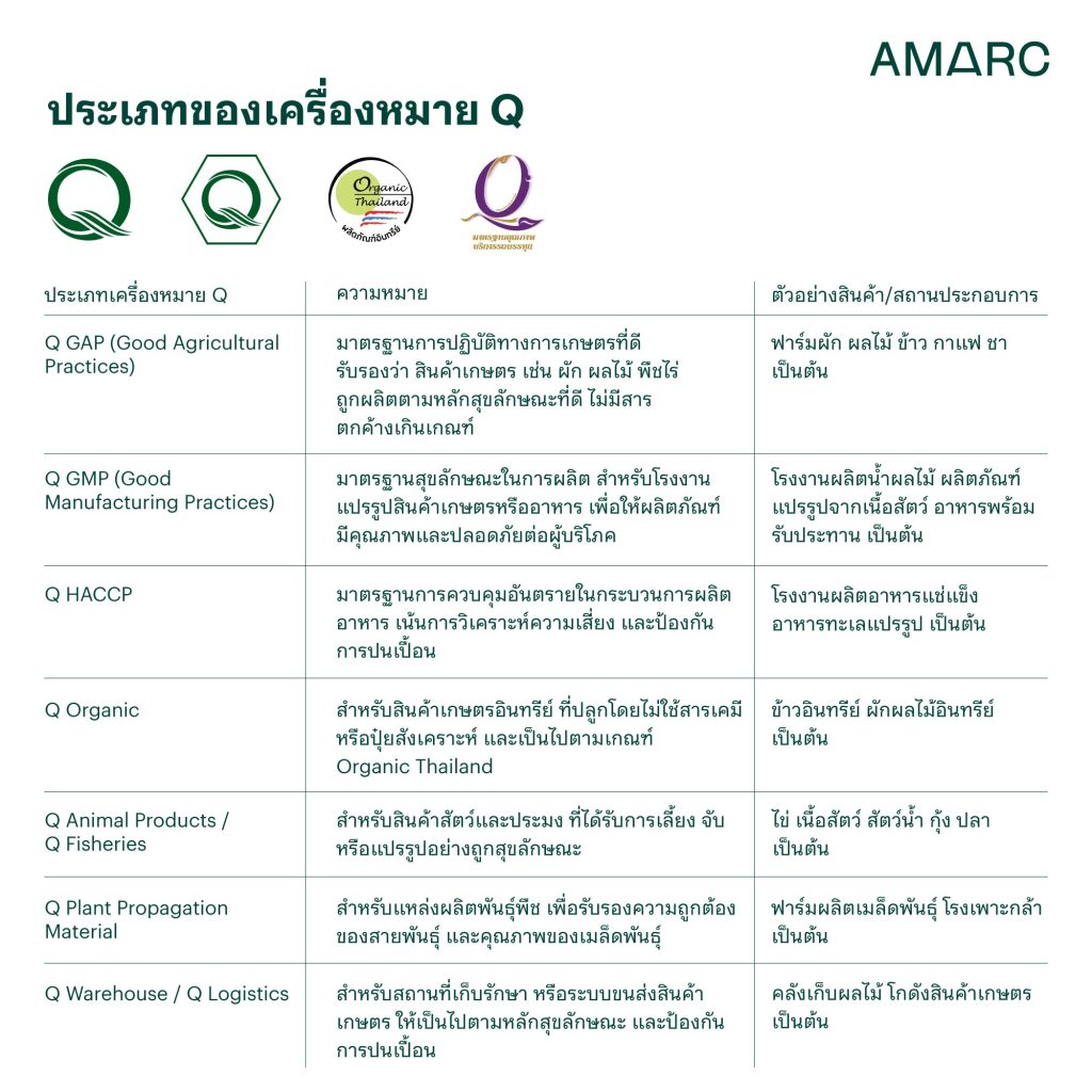 เครื่องหมาย Q หรือ Q-Mark อยู่ภายใต้การกำกับดูแลของสำนักงานมาตรฐานสินค้าเกษตรและอาหารแห่งชาติ (มกอช.) กระทรวงเกษตรและสหกรณ์ จุดมุ่งหมายสำคัญของเครื่องหมายนี้ไม่ใช่เพียงการรับรองตัวสินค้า แต่คือการรับรอง “ระบบการผลิตทั้งหมด” กล่าวให้เห็นภาพง่ายขึ้น เครื่องหมาย Q เปรียบเสมือนการตรวจสอบตั้งแต่ต้นน้ำไปจนถึงปลายน้ำ ไม่ว่าจะเป็นแหล่งวัตถุดิบ ฟาร์ม แปลงปลูก โรงเรือน ระบบการควบคุมศัตรูพืช การใช้สารเคมี การจัดเก็บ การขนส่ง ไปจนถึงกระบวนการแปรรูป ทุกขั้นตอนต้องอยู่ภายใต้มาตรฐานที่กำหนดและสามารถตรวจสอบย้อนกลับได้